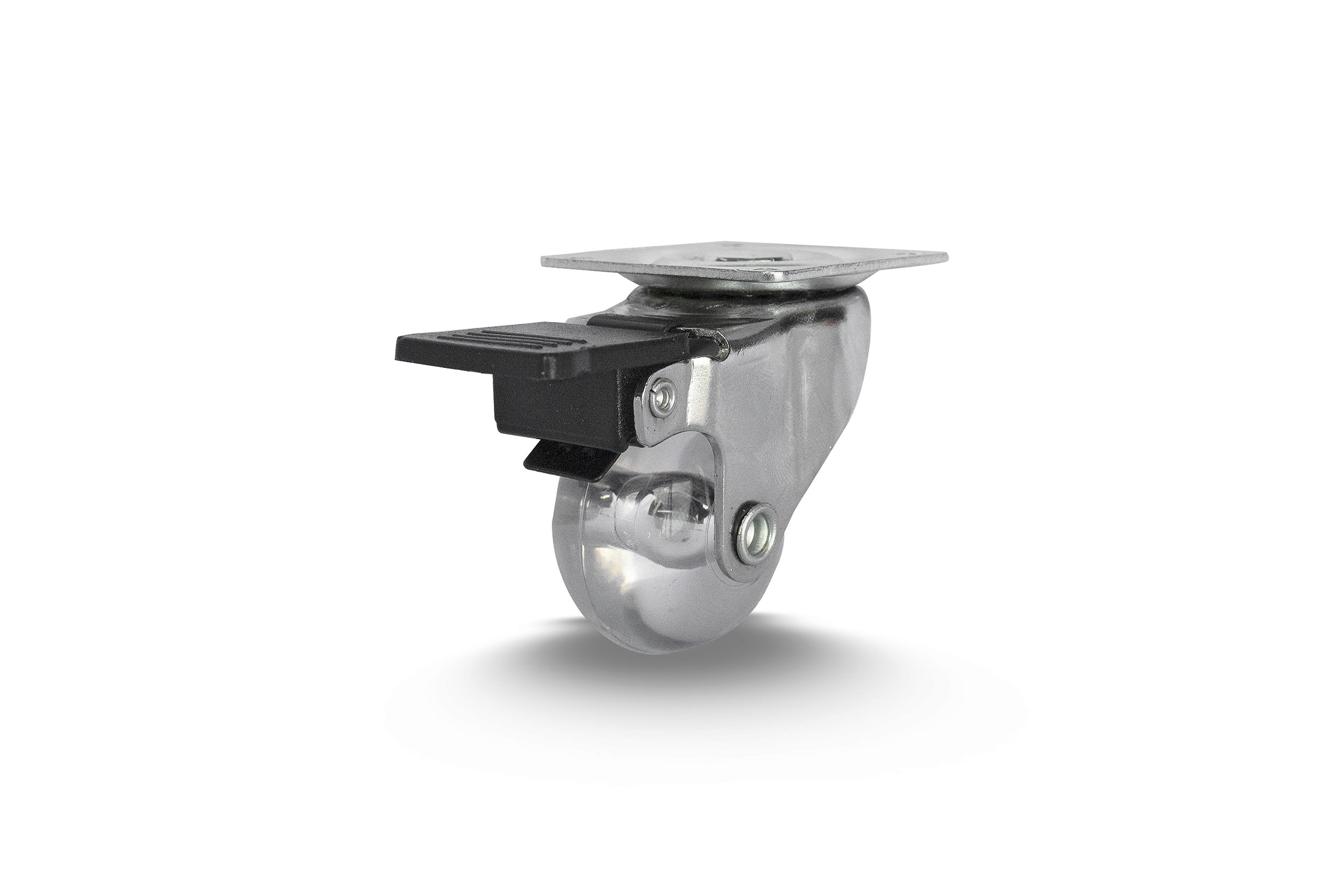 Acabamento Estético: O design moderno com roda em material cristal e garfo cromado oferece um ótimo apelo estético para aplicação em móveis de decoração e design de interiores.