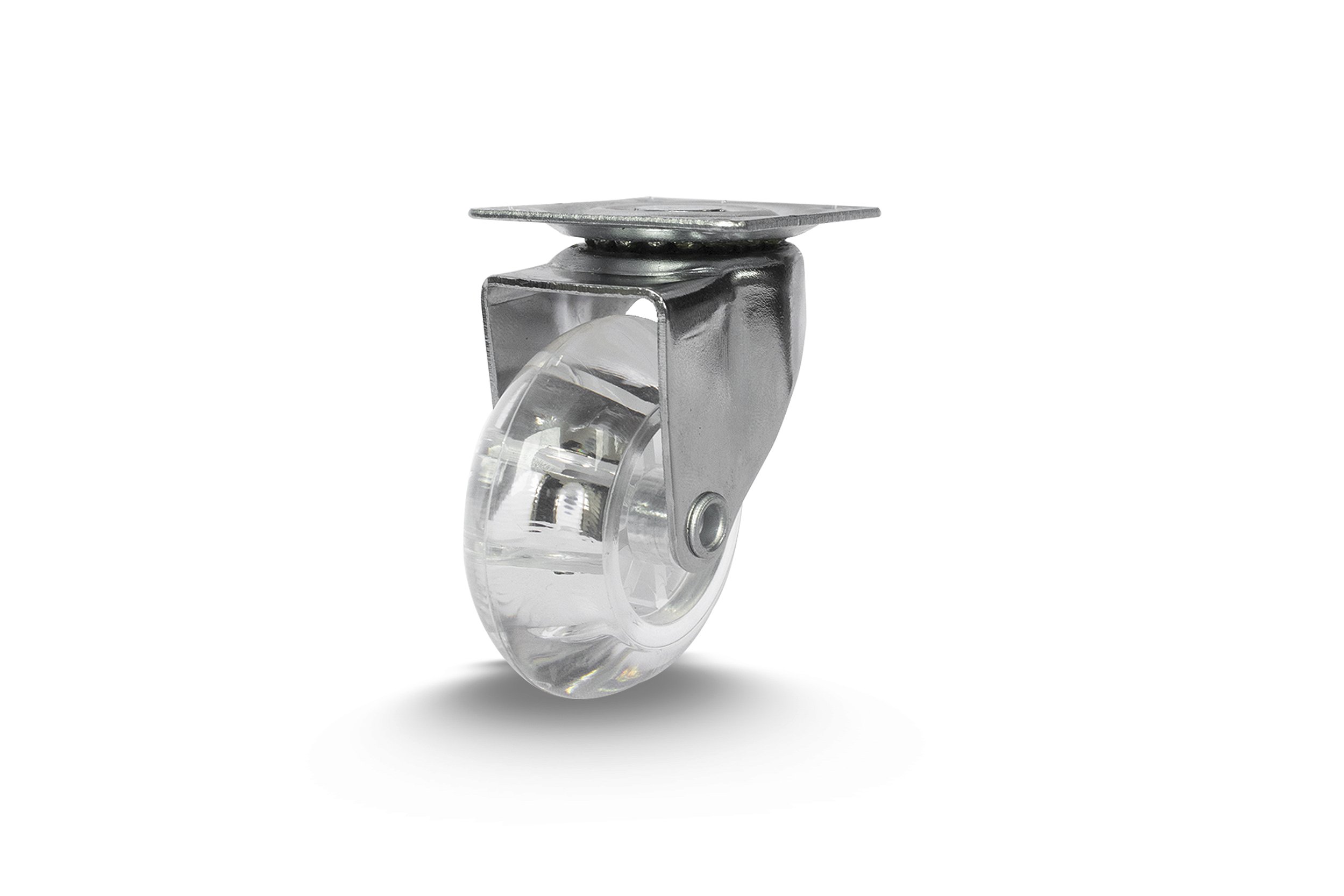 Silencioso e Protetor: A roda de Poliuretano Gel (PU) (frequentemente cristal ou incolor) possui alto grau de maciez, não risca, não marca e amortece vibrações, ideal para pisos sensíveis como madeira, porcelanato e carpetes.