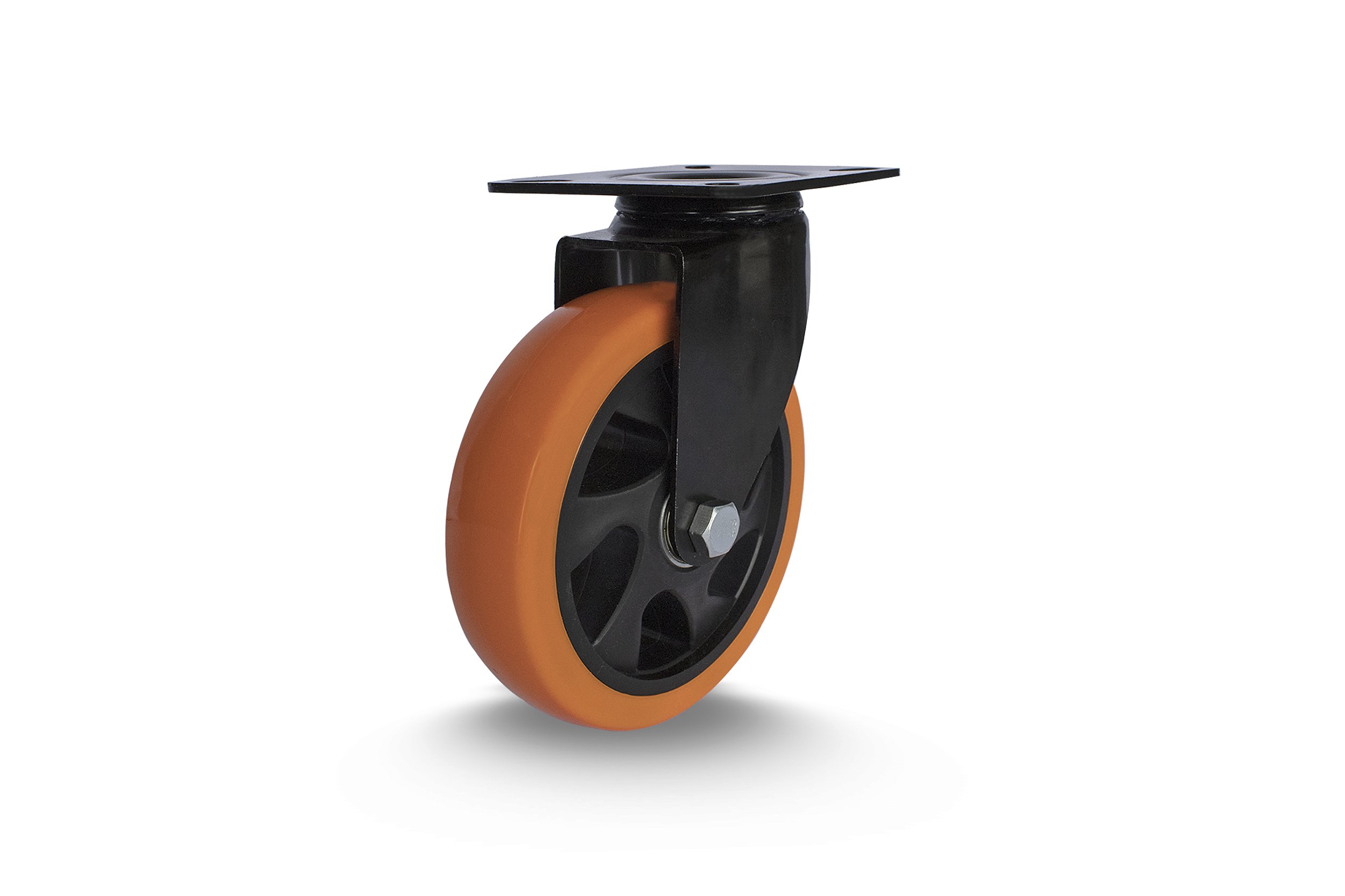Resistência e Proteção: A roda é produzida em poliuretano (PU) laranja de alta qualidade, material que oferece excelente resistência contra abrasão e impactos. Além disso, sua banda de rodagem protege o piso contra marcas e riscos, mantendo a integridade das superfícies.