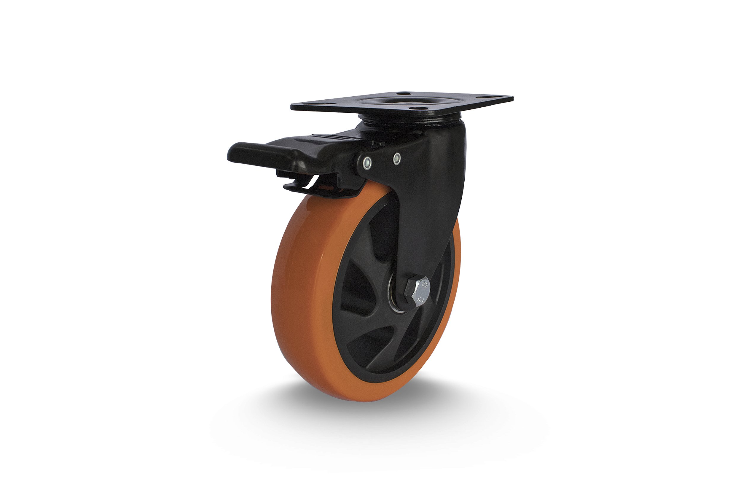 Características Técnicas Tipo de Roda: Poliuretano (PU) Laranja Diâmetro da Roda: 5" (125 mm) Largura da Banda: 32 mm Tipo de Fixação: Placa Giratória com Freio Rodagem: Esferas